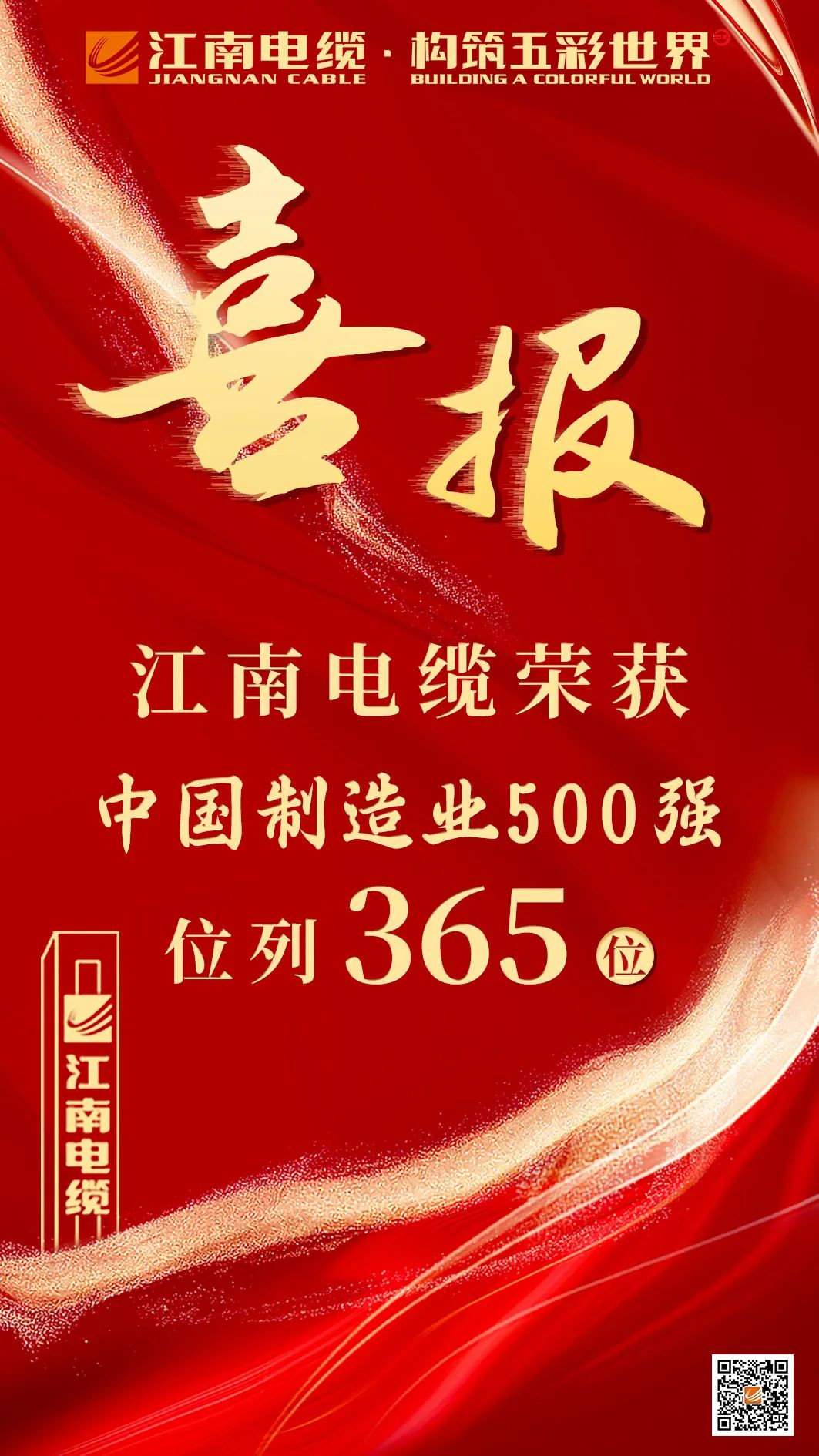 2024世界制造业大会于9月20日在合肥召开,会上发布了“2024中国制造业企业500强”,江南电缆凭借雄厚的实力,荣获2024中国制造业企业500强,位列365位。