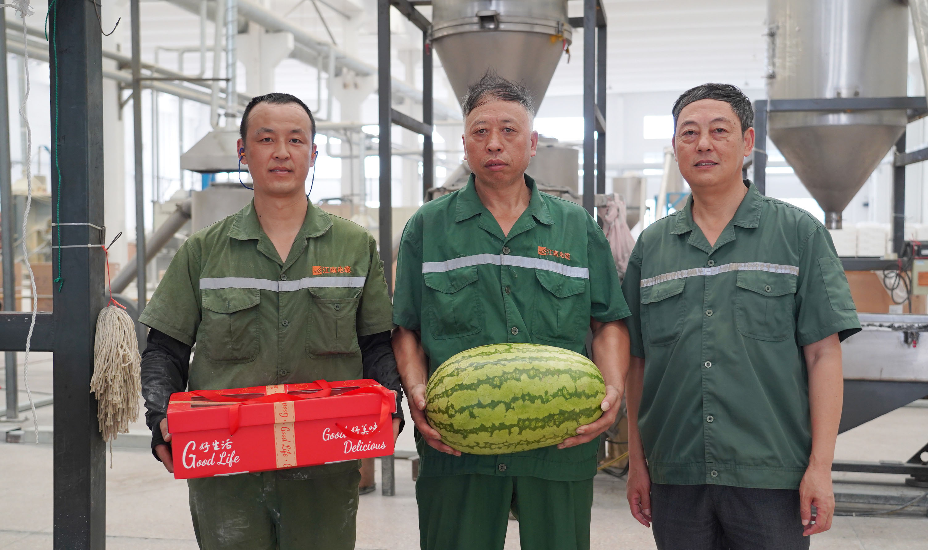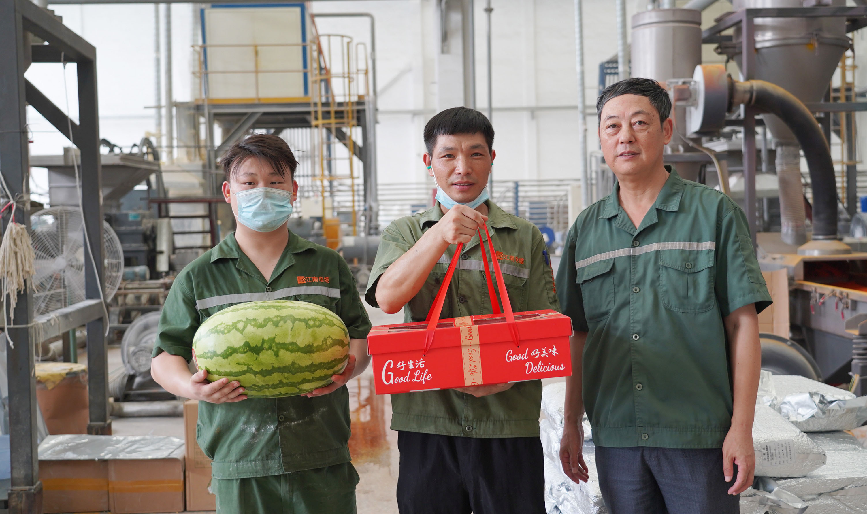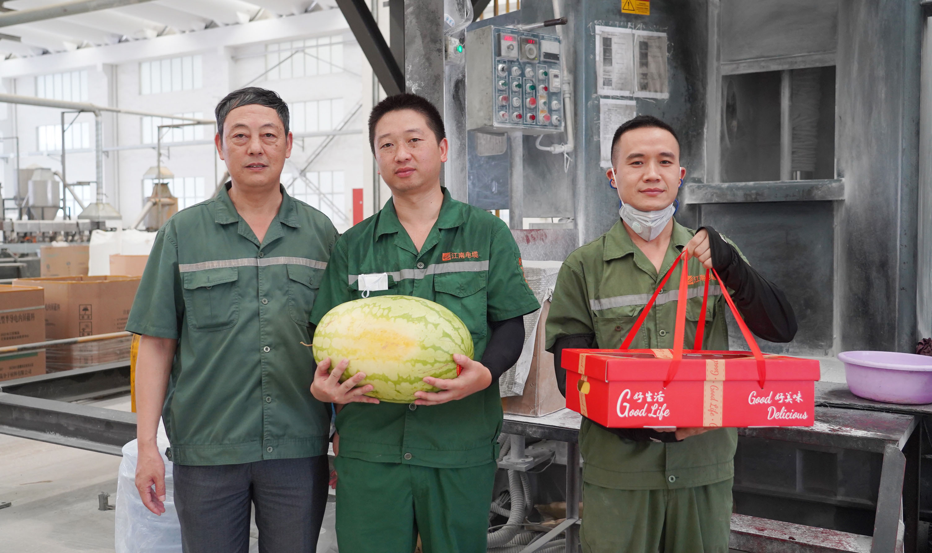 副总经理周骏、总经理助理陆建平赴防火铝线电缆分厂九车间送清凉
