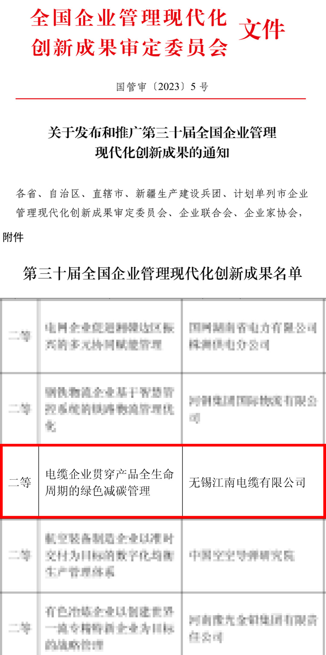 江南电缆《电缆企业贯穿产品全生命周期的绿色减碳管理》荣获第三十届全国企业管理现代化创新成果二等奖。